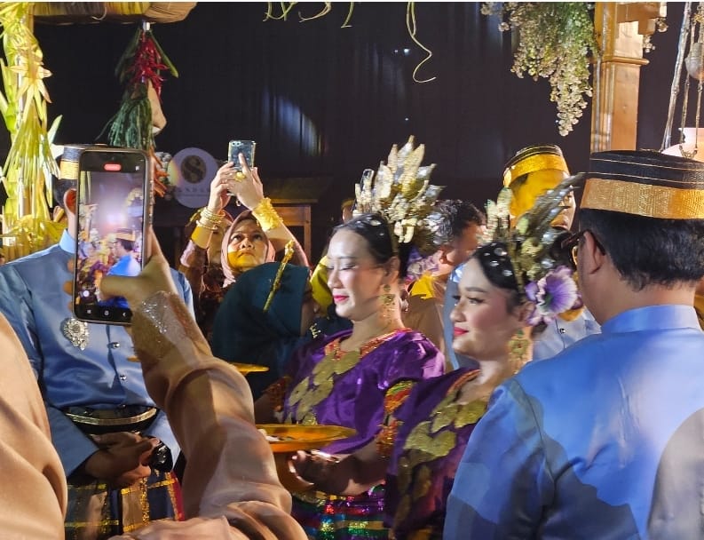 Ketika memasuki gedung, kedua mempelai disambut tarian paduppa. Ini memang tarian tradisional dari masyarakat Bugis-Makassar yang dipersembahkan sebagai tarian selamat datang untuk menyambut tamu kehormatan. Sang mempelai yang mengenakan baju khas Bugis itu tampak serasi melangkah perlahan sampai melambaikan tangan kepada undangan yang berdiri di sisi kiri dan kanan.