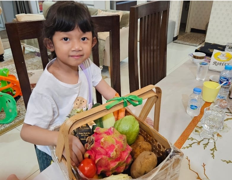 Di atas meja undangan kehormatan (VIP) juga ada hiasan buah dan sayur. Ada kacang panjangnya dan terong. Dan ketika undangan pulang, cenderamatanya juga sekeranjang buah dan sayur. Semuanya yang datang sangat bahagia dan merasa dapat hadiah yang surprised.