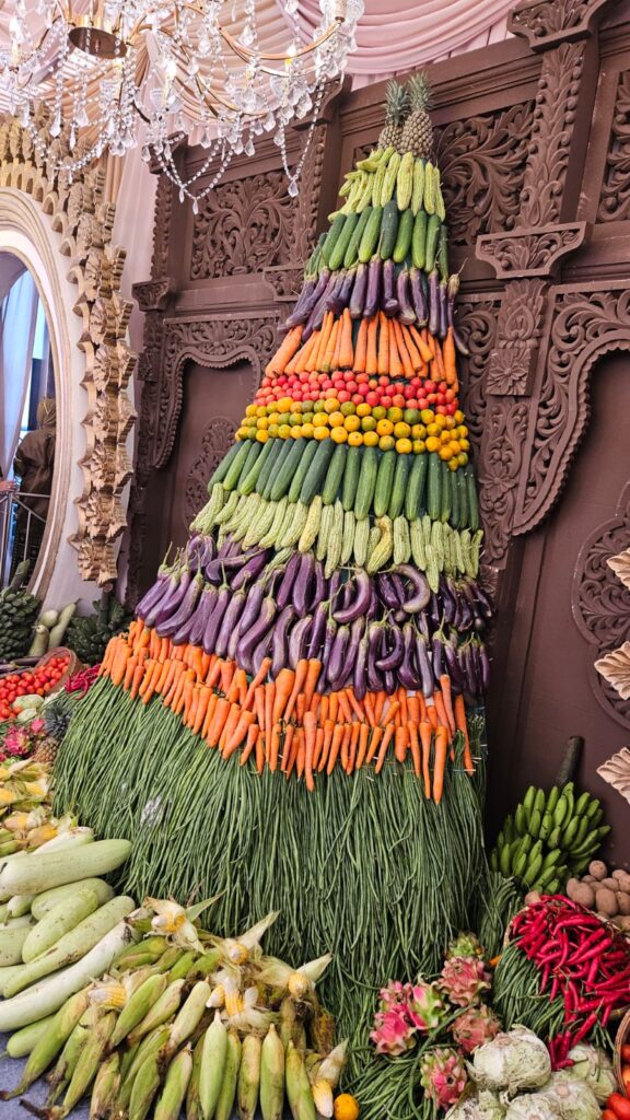 Di depan panggung mempelai, juga semua dihiasi dengan sayur dan buah-buahan dari jenis yang sama. Sangat meriah dan penuh warna. Sebagian undangan mengaku takjub karena biasanya dekor pengantin penuh dengan aroma bunga bukan sayur dan buah.