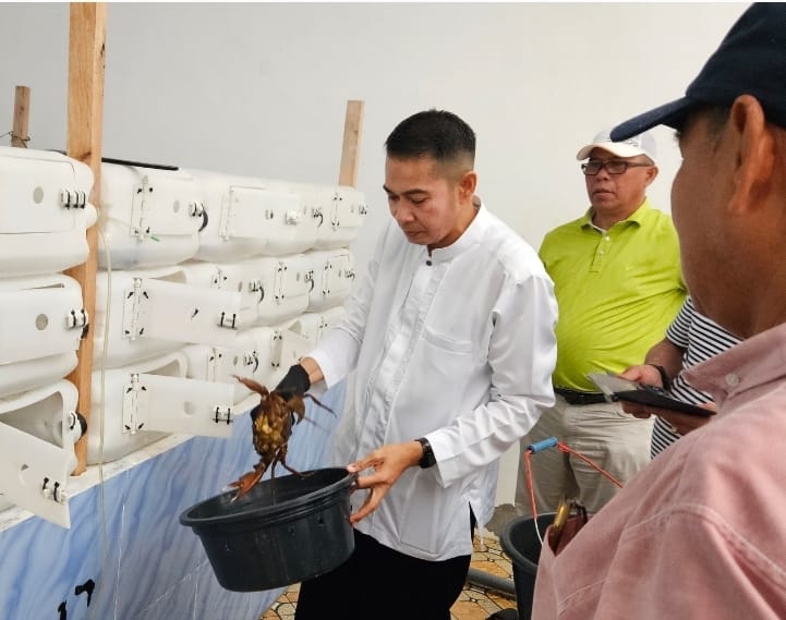 Dia memelihara dan membesarkan kepiting bakau. Awalnya dia beli anakan atau kepiting muda hasil tangkapan nelayan. Lalu dia masukkan dalam jerikuen putih ukuran 20 liter yang ditumpuk-tumpuk seperti apartemen. Tiap jeriken berhubungan dengan jeriken lain dengan pipa air. Tiap satu jeriken, diisi satu kepiting. Tidak bisa dua atau lebih karena akan berkelahi.