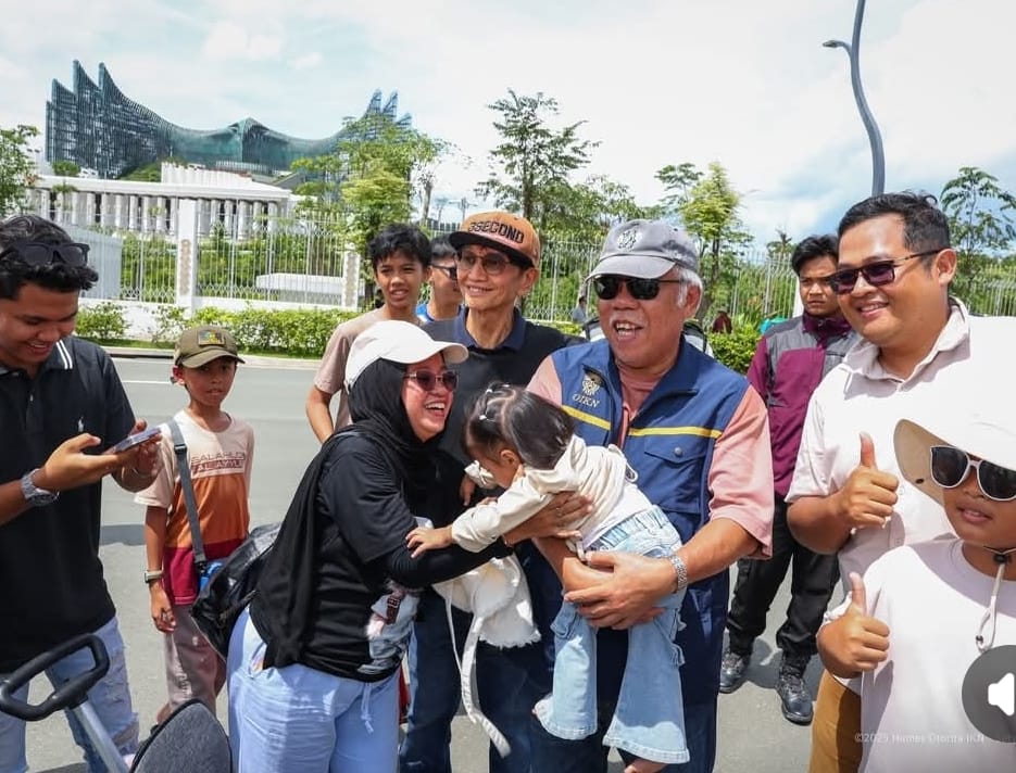 Kepala Otorita IKN Basuki Hadimuljono menggendong anak pengunjung di depan Istana Garuda IKN.