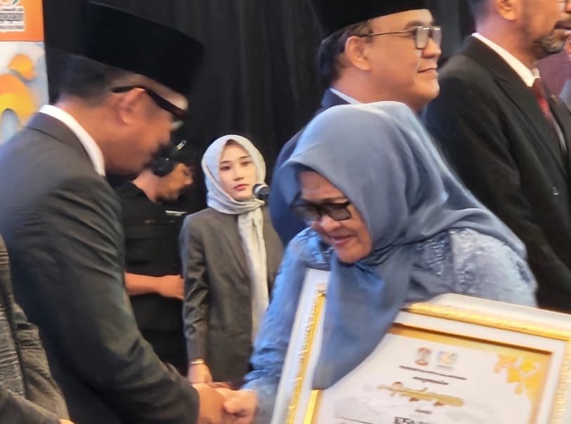 Wali Kota Balikpapan menyerahkan penghargaan kepada Ibu Kisnawati, yang menghibahkan tanah untuk sekolah.